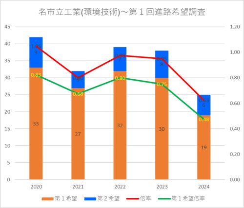 【2024(2025春)】名市立工業(環境技術)~第2回進路希望調査はこちら 【2024(2025春入試)】名市立工業(環境技術)~第1回進路希望調査【2020~2024】 第1回 定員 希望者数 第1希望 第2希望 倍率 第1希望倍率 2020 40 42 33 9 1.05 0.83 2021 40 32 27 5 0.8…