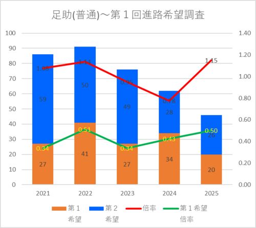 【2025(2026春入試)】足助(普通)~第1回進路希望調査【2021~2025】 第1回 定員 希望者数 第1希望 第2希望 倍率 第1希望倍率 2021 80 86 27 59 1.08 0.34 2022 80 91 41 50 1.14 0.51 2023 80 76 27 49 0.95 0.34 2024 80 62 34 28 0.78 0.43 2025 40 46 …