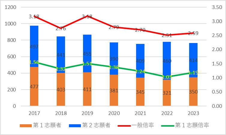 2022年までは,推薦入試と一般入試が同時に行われていたため,第1志望から推薦の合格者を除いてあります。