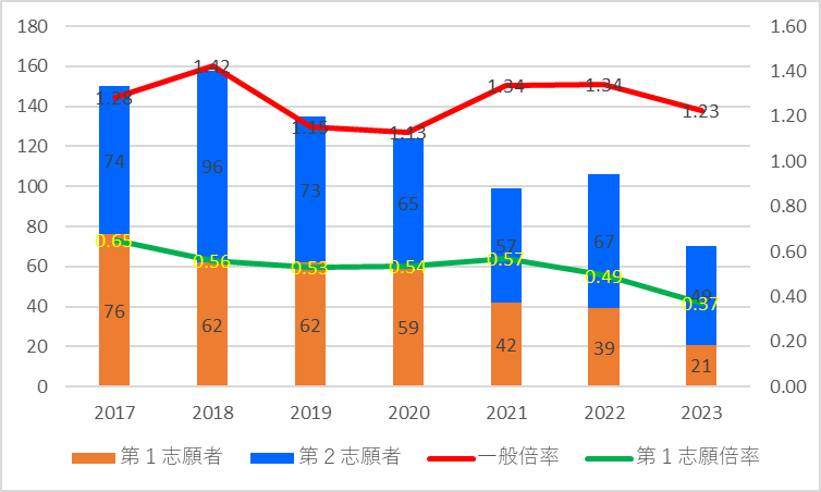 | 一般定員 | 志願者数 | 第1志願者 | 第2志願者 | 一般倍率 | 第1志願倍率 | |
