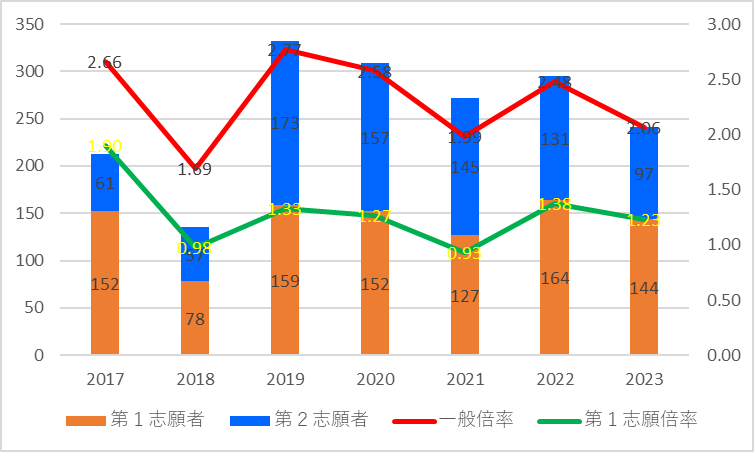 | 一般定員 | 志願者数 | 第1志願者 | 第2志願者 | 一般倍率 | 第1志願倍率 | |