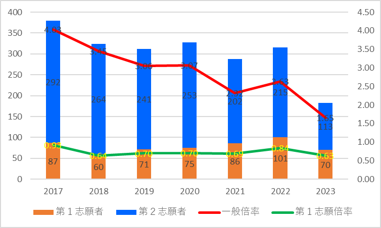 | 一般定員 | 志願者数 | 第1志願者 | 第2志願者 | 一般倍率 | 第1志願倍率 | |