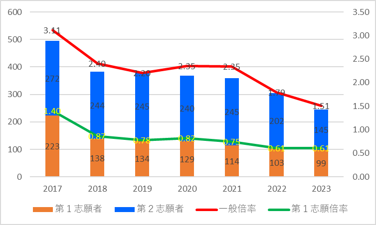 | 一般定員 | 志願者数 | 第1志願者 | 第2志願者 | 一般倍率 | 第1志願倍率 | |