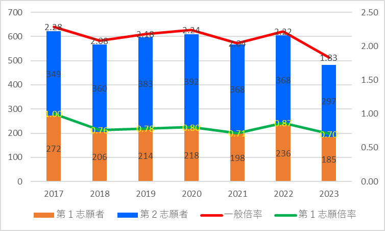 | 一般定員 | 志願者数 | 第1志願者 | 第2志願者 | 一般倍率 | 第1志願倍率 | |