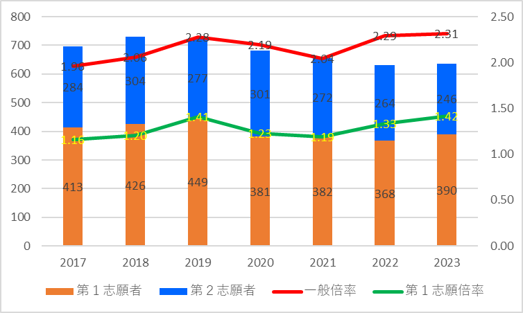 | 一般定員 | 志願者数 | 第1志願者 | 第2志願者 | 一般倍率 | 第1志願倍率 | |