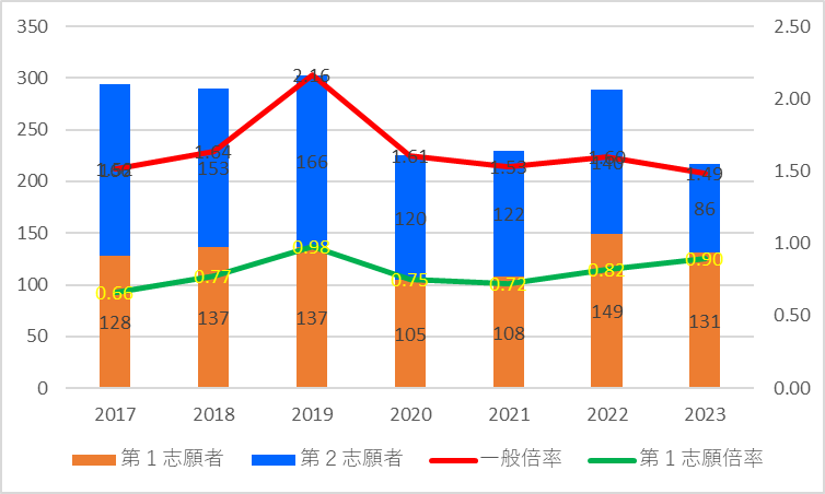 | 一般定員 | 志願者数 | 第1志願者 | 第2志願者 | 一般倍率 | 第1志願倍率 | |