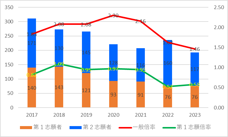 | 一般定員 | 志願者数 | 第1志願者 | 第2志願者 | 一般倍率 | 第1志願倍率 | |