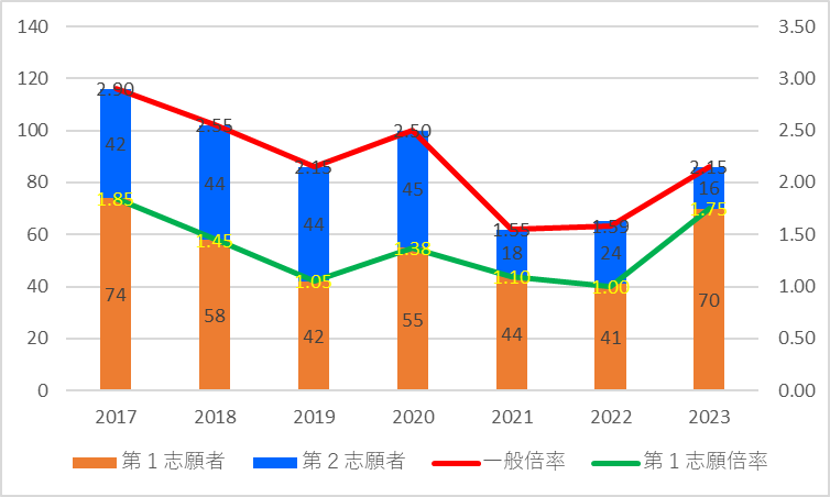 | 一般定員 | 志願者数 | 第1志願者 | 第2志願者 | 一般倍率 | 第1志願倍率 | |