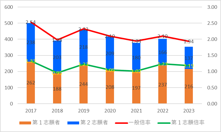 | 一般定員 | 志願者数 | 第1志願者 | 第2志願者 | 一般倍率 | 第1志願倍率 | |