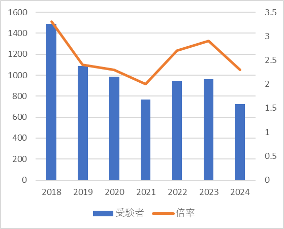 | 受験者 | 1491 | 1086 | 983 | 767 | 941 | 963 | 725 |