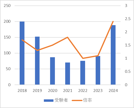 | 受験者 | 200 | 152 | 87 | 70 | 76 | 91 | 188 |