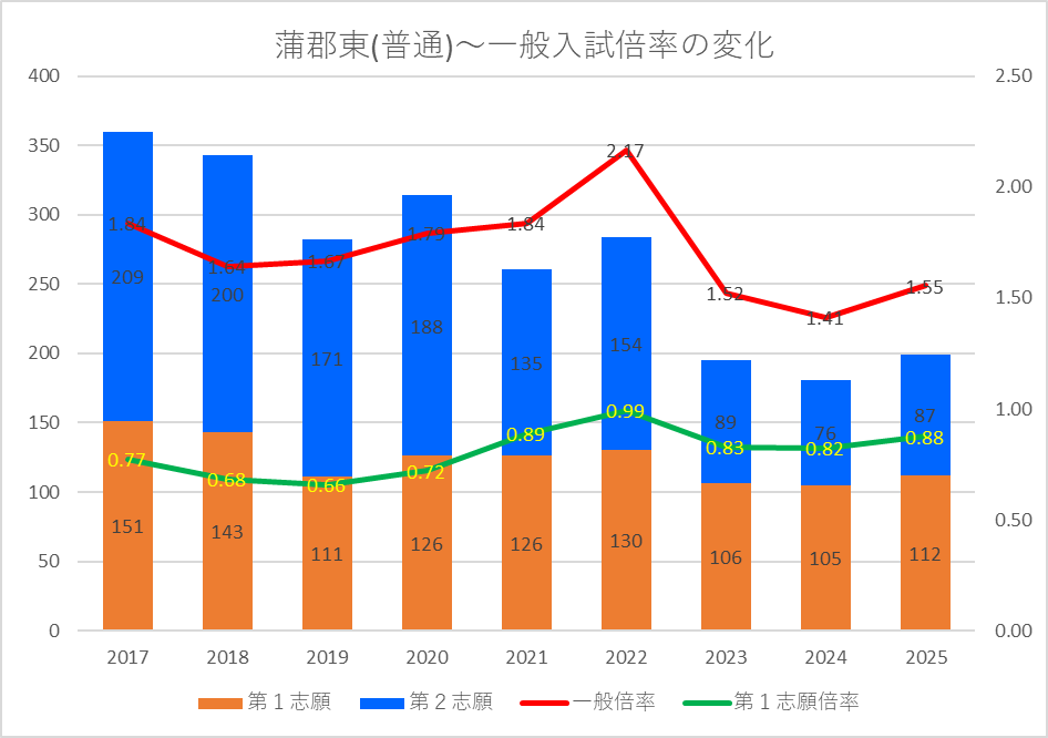 【2025春~愛知県公立高校】蒲郡東(普通)の一般入試倍率【2017~2025の比較】