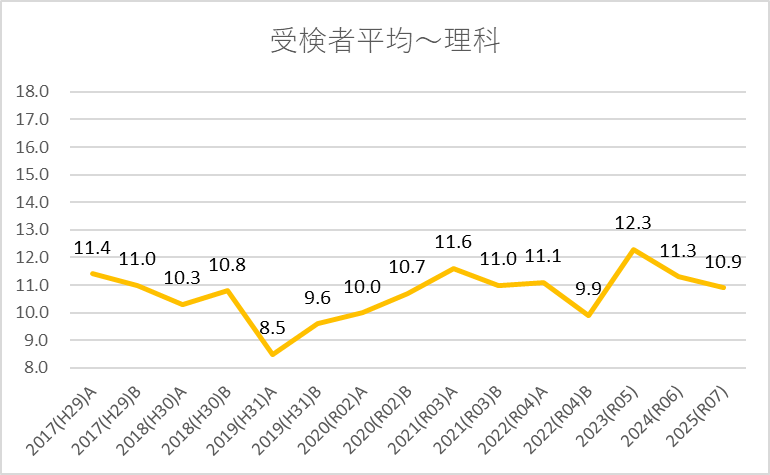 理科は,昨年と比べて-0.4点で難化しましたが,例年と比べると平均的でした。