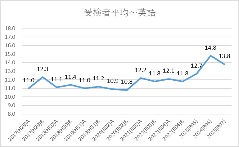 国語は,昨年と比べて +4.4点で大幅に易化しました。昨年度が過去最も難しかったのが,揺り戻しで最も簡単になってしまいました。